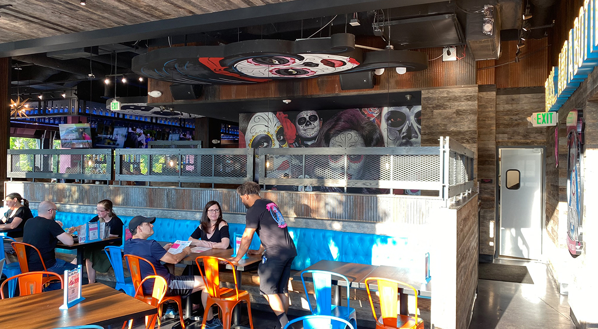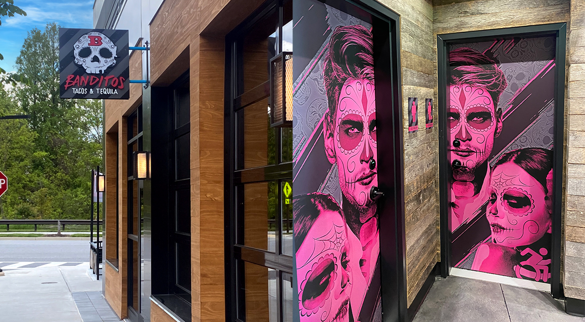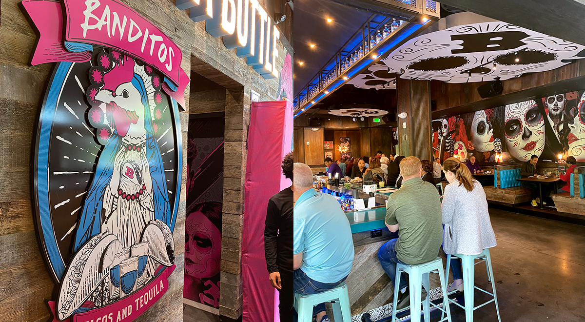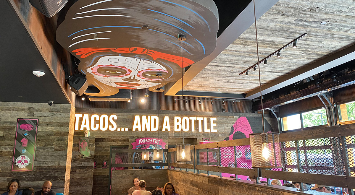 Banditos Bar & Kitchen is a vibrant sports bar and restaurant located in the heart of Columbia’s bustling Merriweather District. The space features a kitchen, bar, and both indoor and outdoor dining areas designed for an unforgettable experience. The design incorporates rustic touches like reclaimed wood, weathered corrugated steel, and custom wall graphics, creating a lively yet inviting atmosphere that has quickly become a go-to destination for locals and visitors alike.